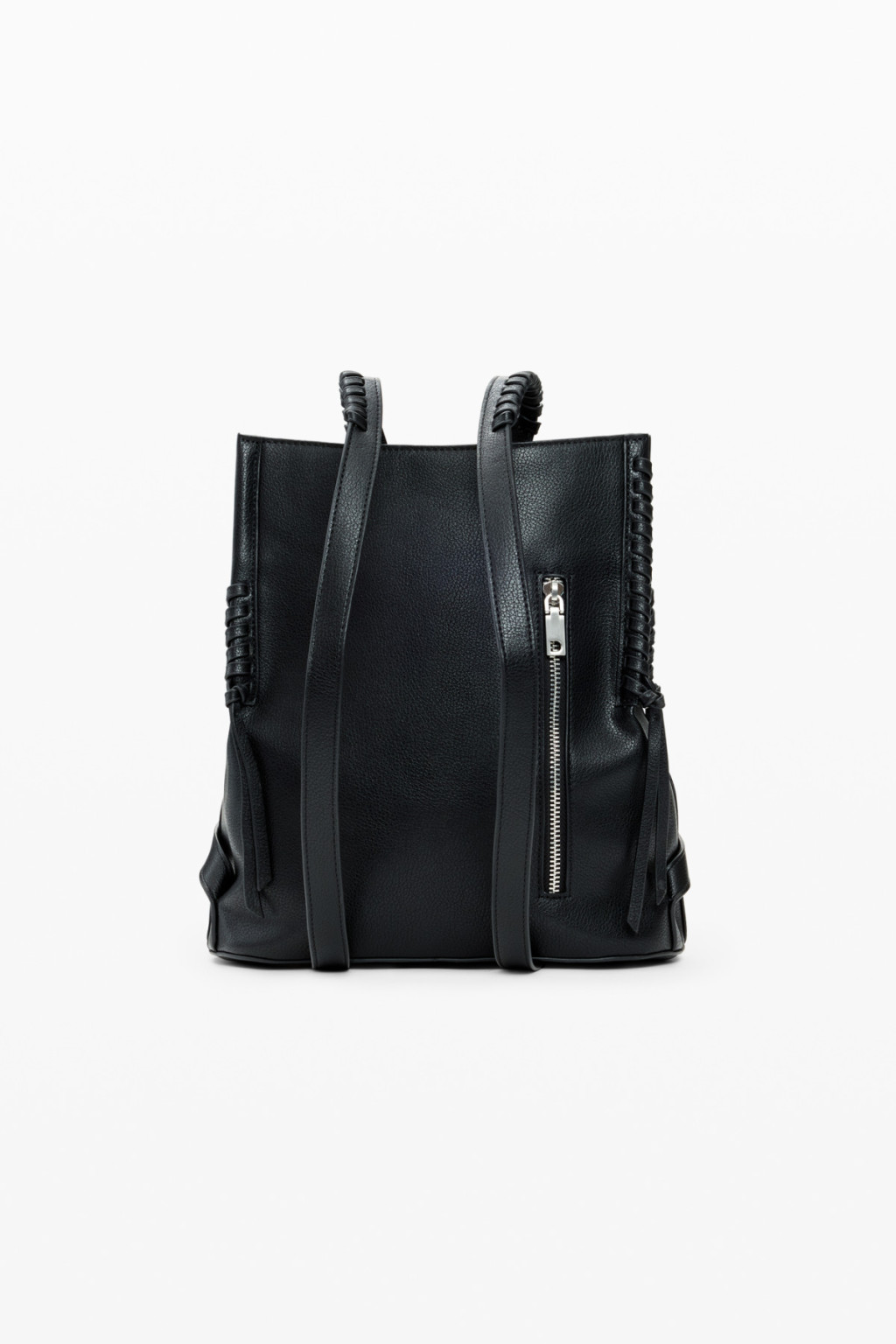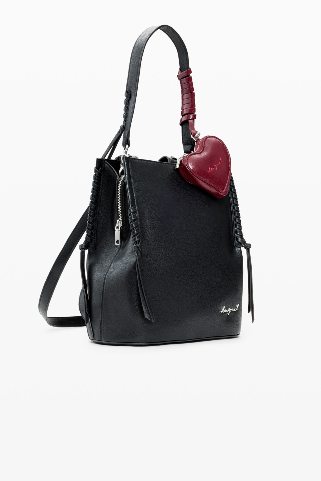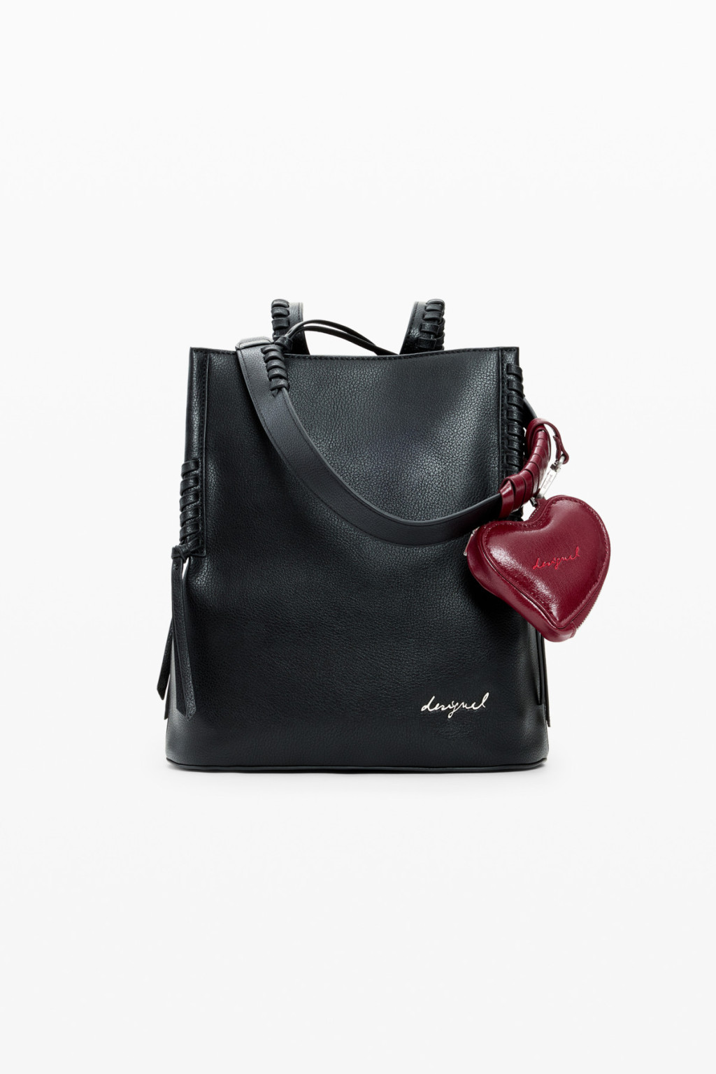Közepes méretű hátizsák levehető pánttal, levehető, szív alakú mini pénztárcadísszel és fonott részletekkel.